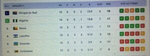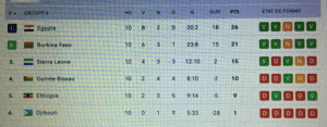 A la fin des matchs de la dixième journée des éliminatoires zone Afrique pour la Coupe du monde 2026, nous avons simplement noté les noms des équipes qui occupent la tête de chacun des neuf groupes, en comptabilisant tous les matchs joués. Ce qui nous a donné comme qualifiés: Egypte, Sénégal, Afrique du Sud, Cap-Vert, Maroc, Côte d’Ivoire, Algérie, Tunisie et Ghana.